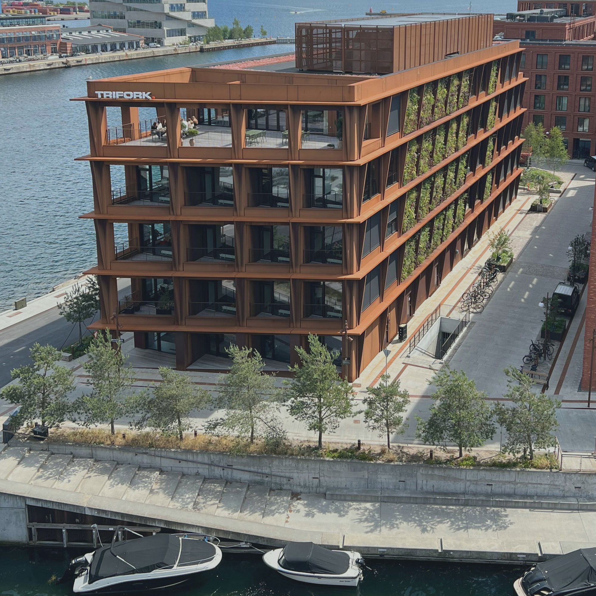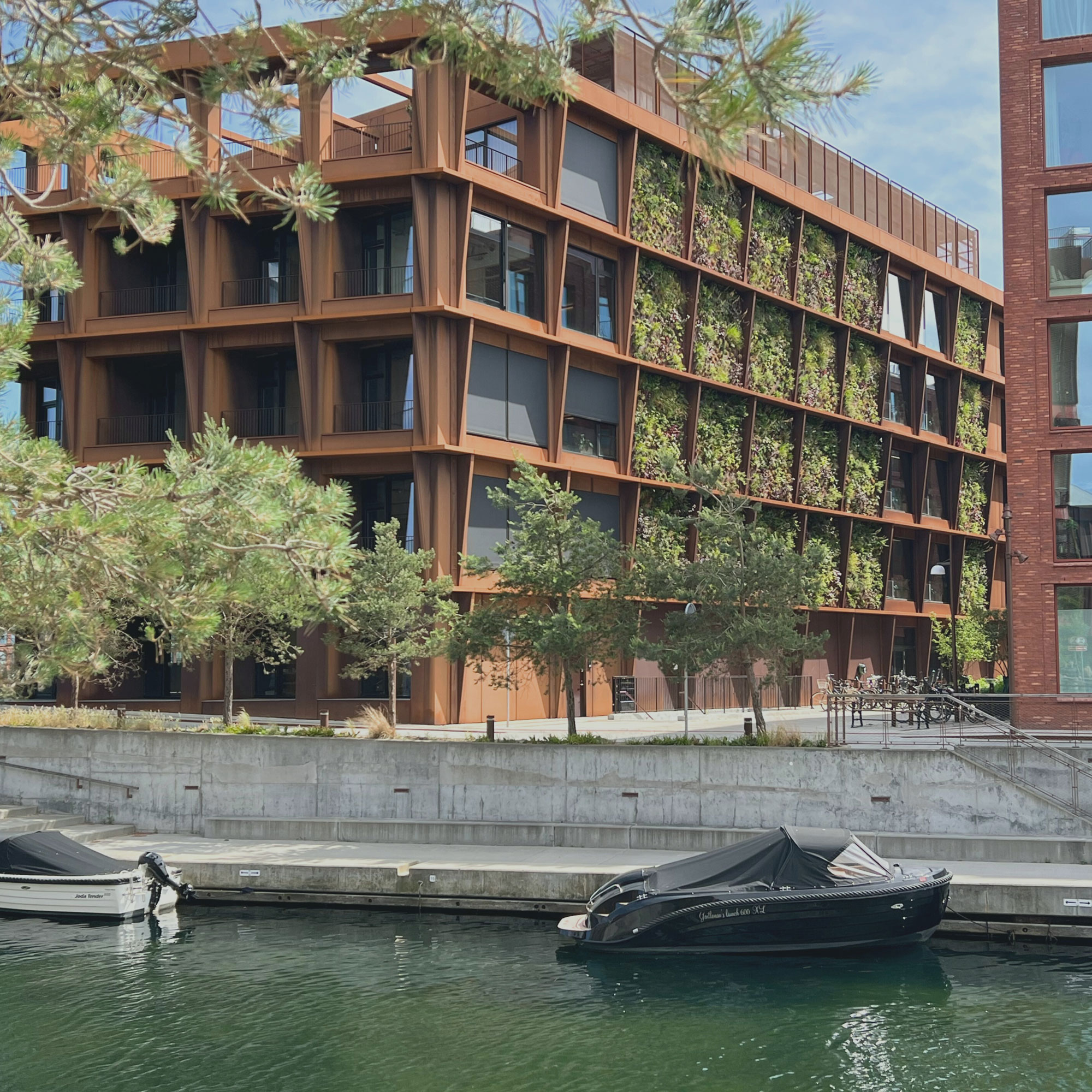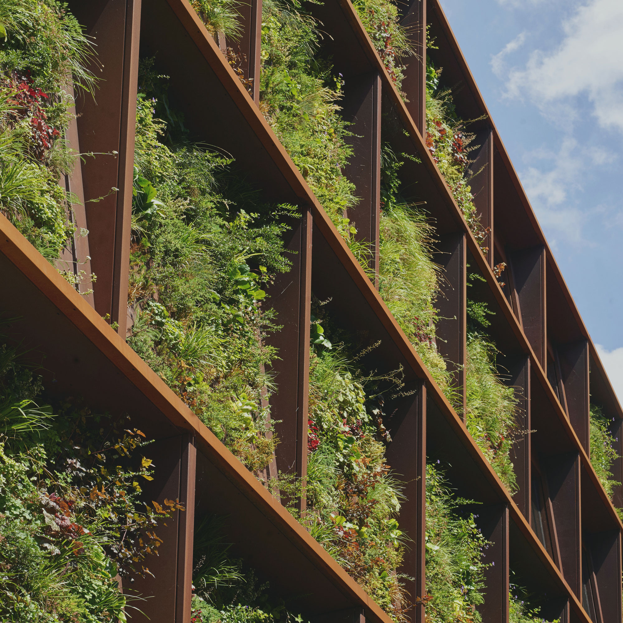Die meisten Grünfassadensysteme bestehen aus Mineralwolle als Substrat und Kunststoffen für die Konstruktion. Sie sind wartungsintensiv und selten kreislauffähig. Darüber hinaus werden sie als zusätzliche Schicht AUF eine fertige Fassade appliziert. Das dänische Architekturbüro Henning Larsen Architects suchte deshalb nach einer Lösung, die langlebig ist und ein integraler Bestandteil der Gebäudehaut sein kann. Gemeinsam mit Byggros und Komproment wurde über acht Jahre hinweg eine Lösung entwickelt, die konsequent aus der Pflanzenperspektive gedacht wurde. Dabei floss die Expertise von Byggros, seit Jahrzehnten auf urbane Grünflächen, Gründächer, Retentionssysteme und Biodiversität im Stadtraum spezialisiert, maßgeblich in die Formulierung des neuen Grünfassadensystems ein.