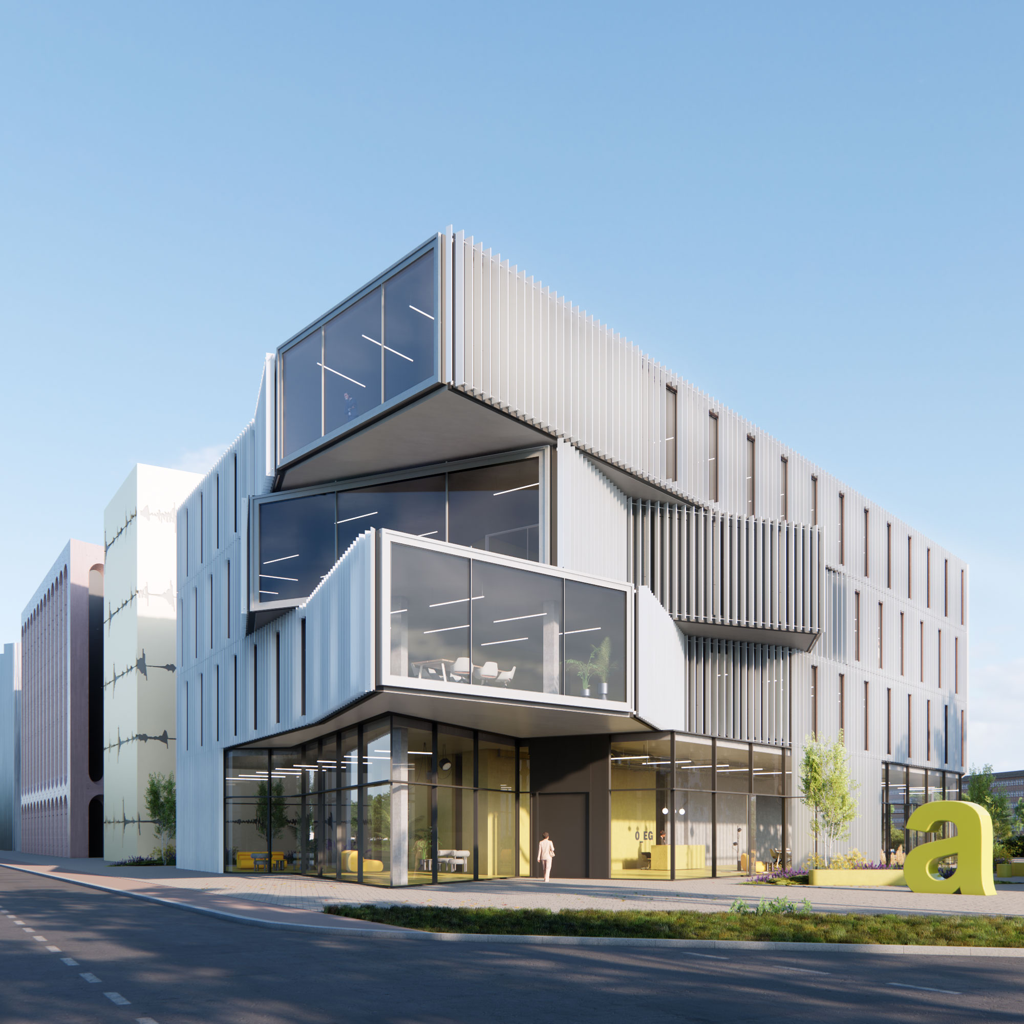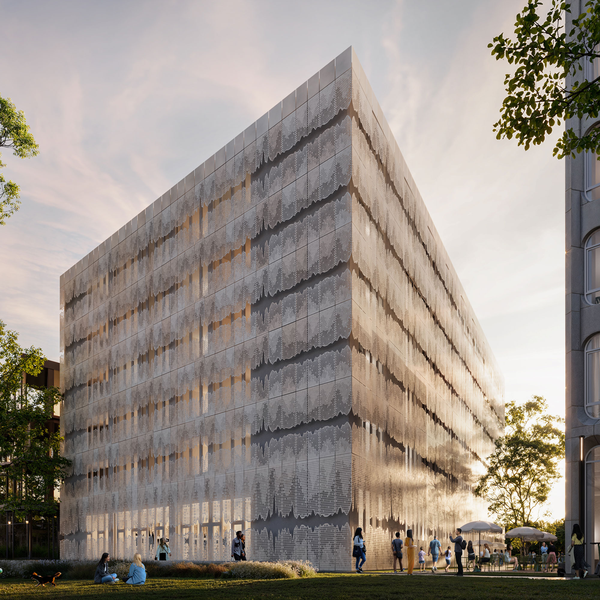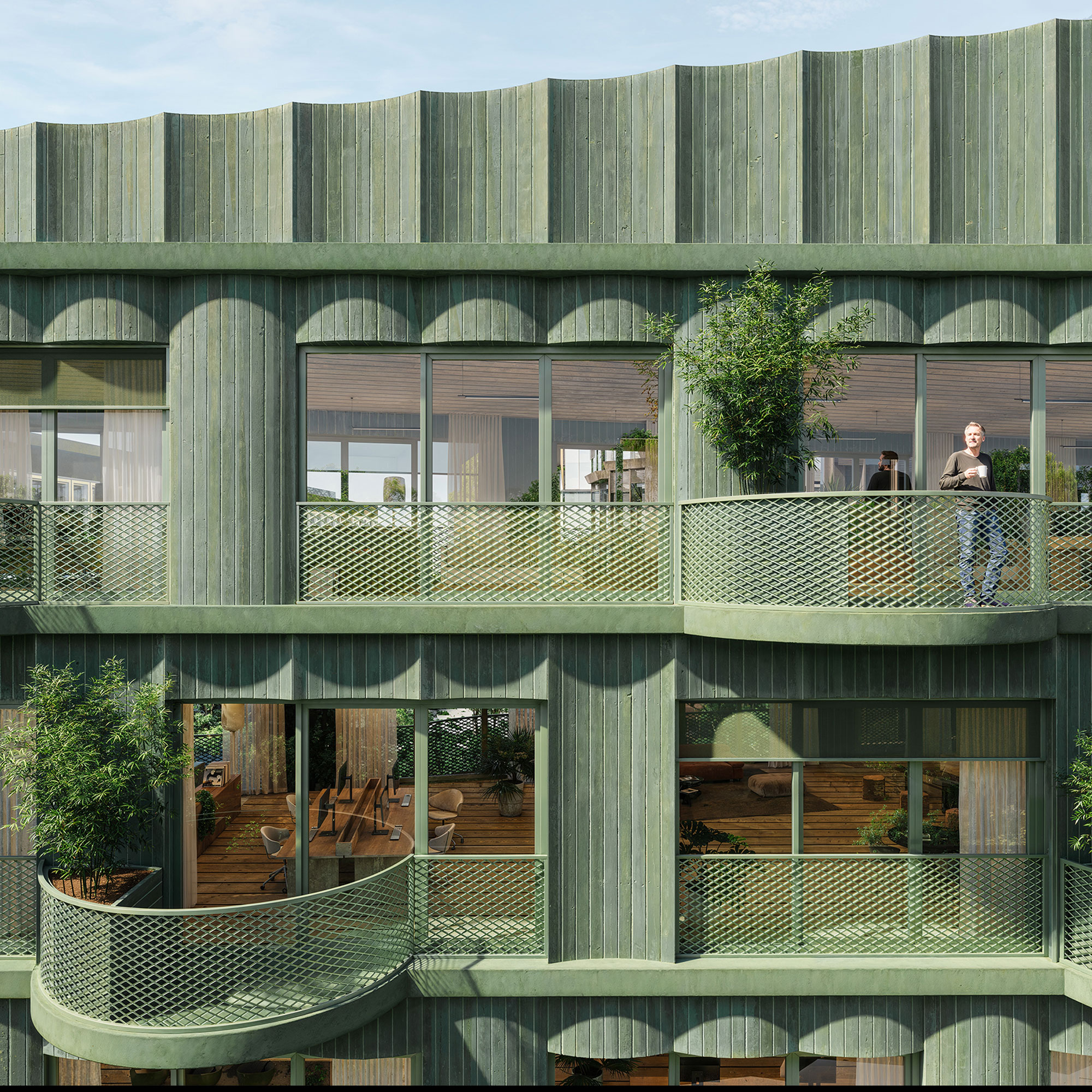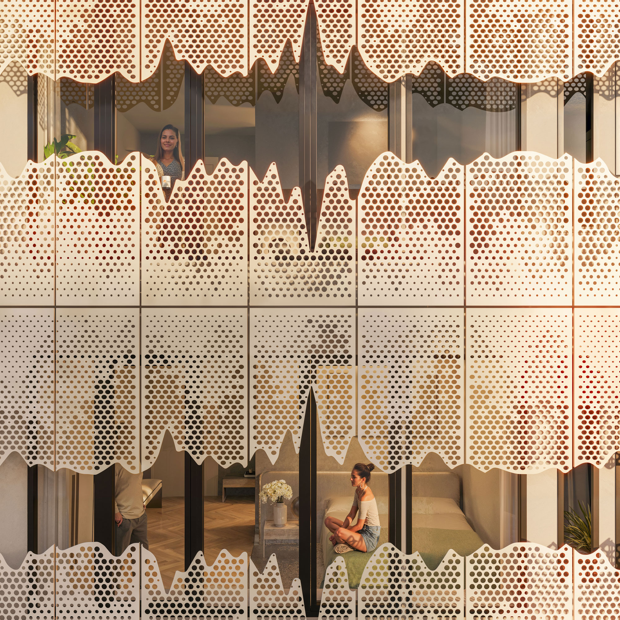 Erik Behrends – Grüntuch Ernst Architekten – Station B: Coliving Apartments. Geschichtete, perforierte Fassade als urbanes Angebot. Visualisierte Audiospur als Gestaltungselement und Referenz zum Funkhaus.