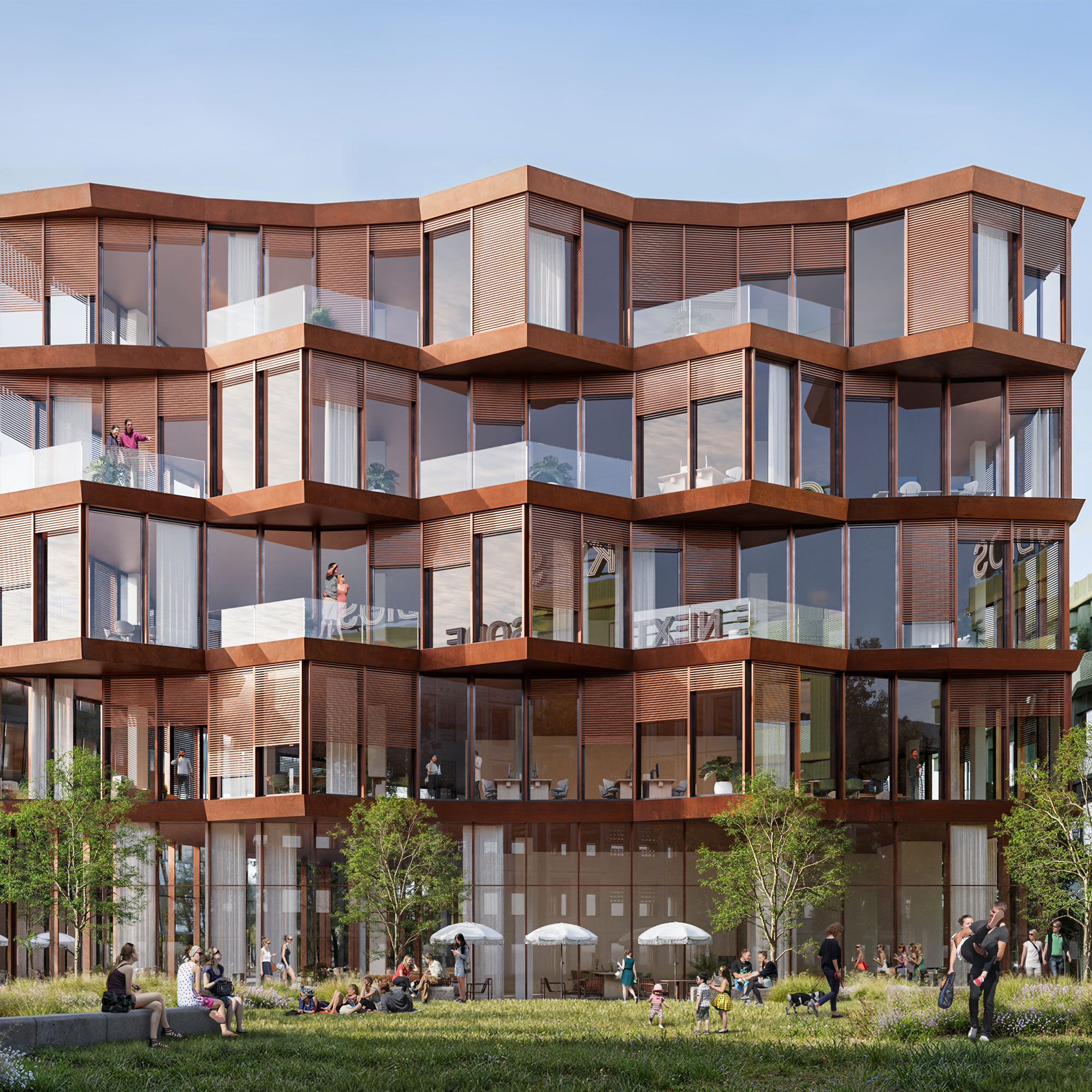 Sergei Tchoban – Tchoban Voss Architekten – Station G: Cortenstahl als Industriereferenz. Plastisch gestaltete Fassadenkanten mit Balkonen und großflächigen Verglasungen formen eine offene Büronutzung.
